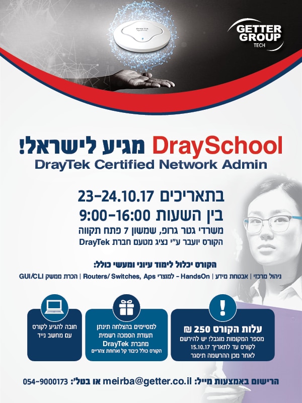 הקורס יפתח בתאריכים 23-24.10.17 ויועבר ע"י נציג מחברת DrayTek העולמית.